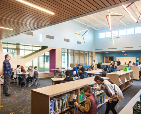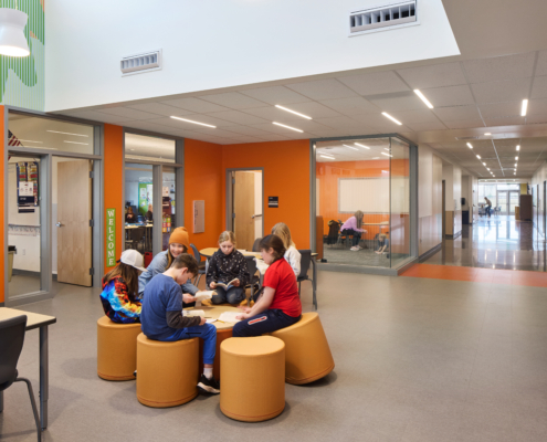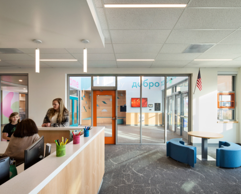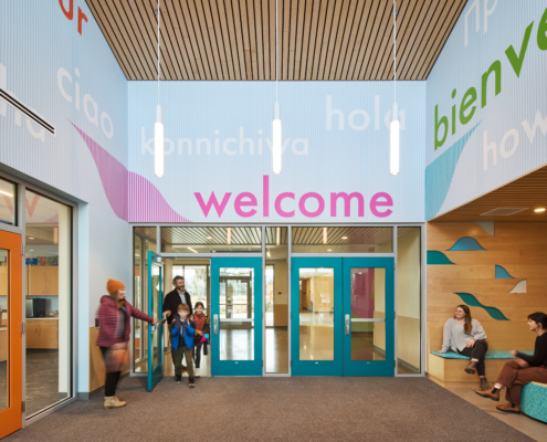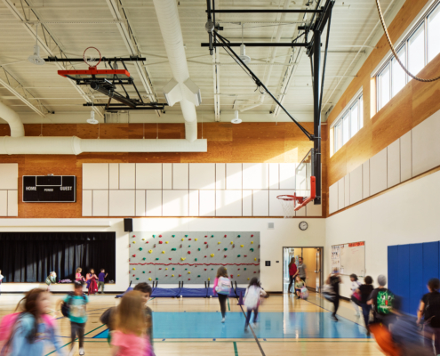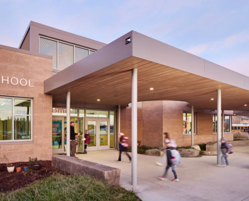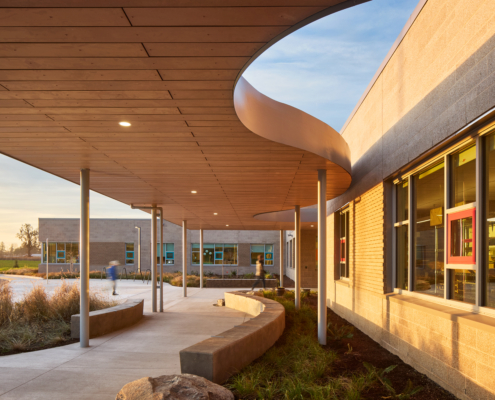 Located in the heart of Dundee, Oregon, this is a brand new elementary school, designed and built as a replacement for the original Dundee Elementary School on a greenfield site. It is a single story, fully electric building with a CLT covered play and wood details throughout including glulam beams. Throughout the 68,000 sf school, vibrant colors wash the hallways providing a playful environment for the students.