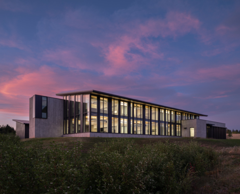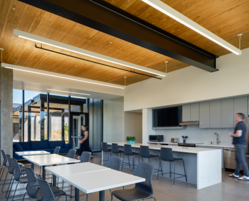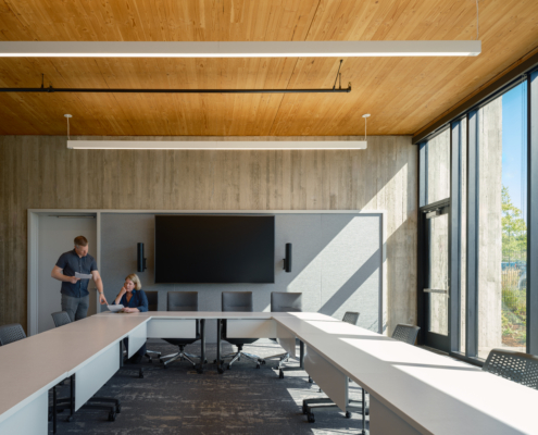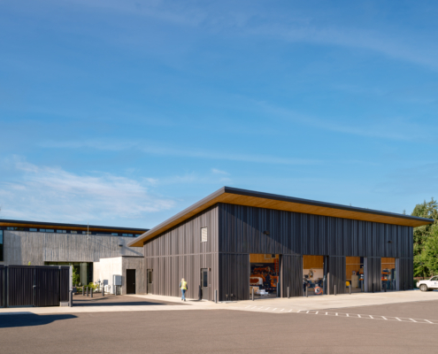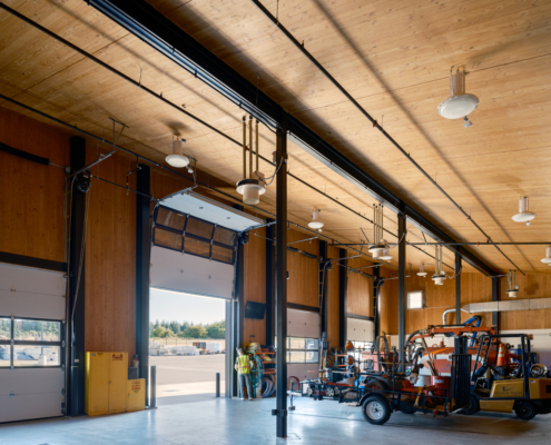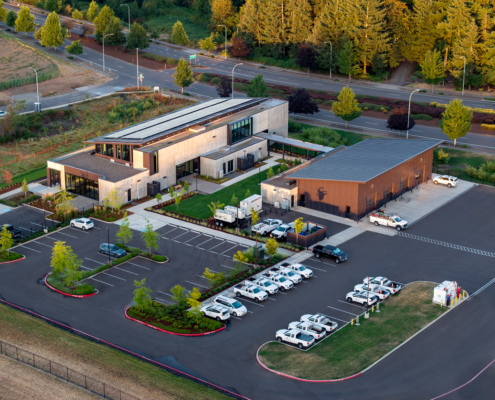 The highly sustainable new campus features a 15,000 sf administrative office and a 5,700 sf shop and operations building to store fleet and equipment. Construction also included associated parking lots, patio space, 2 driveways, a fueling site, and landscaping including 6 storm swales acting as storm water demonstration features for the community. Both buildings were constructed with cross-laminated timber (CLT), concrete, and steel hybrid systems.