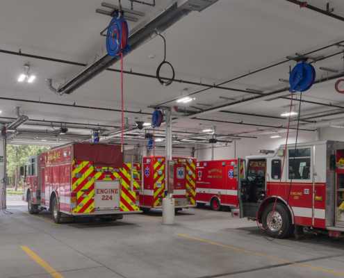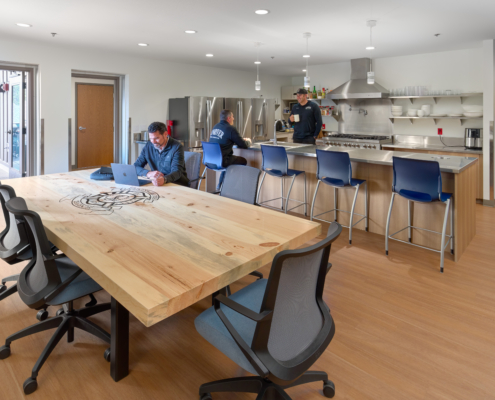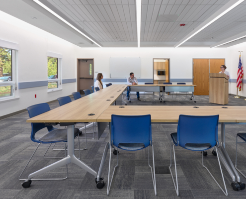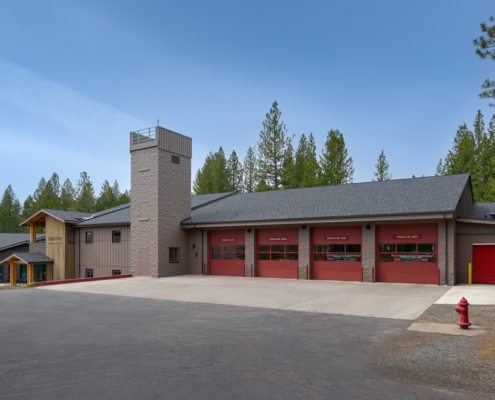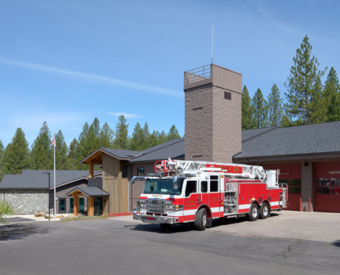 The Sunriver Service District was formed in 2002, which is a special district managing the Sunriver Police and Fire Departments. Both departments have effectively served the residents and visitors of Sunriver; however, rapid community growth and aging facilities no longer met modern public safety standards. In response, the Sunriver Service District Board led a successful bond measure to fund a new, combined Public Safety Building through the renovation and expansion of the existing fire station, increasing its footprint from 12,750 to 31,589 sf. The consolidated facility brings both fire and police departments under one roof, improving operational efficiency through shared administrative spaces, training rooms, and fitness facilities, while providing the public with a centralized location for public safety services. Key project priorities included the addition of gender-neutral living quarters, restrooms, and shower accommodations, as well as decontamination rooms and steam showers to enhance firefighter health and safety. The resulting Sunriver Public Safety Building is a highly functional and efficient facility that supports long‑term public safety needs, improves recruitment and retention of first responders, and reflects the community’s pride in and commitment to public safety.